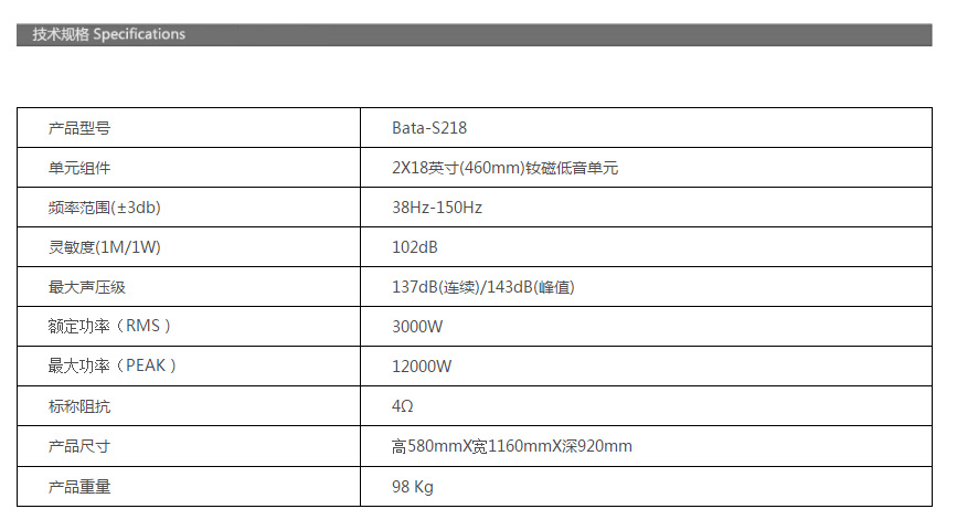 特色:Bata-S218是一款專為地面堆疊應(yīng)用而設(shè)計(jì)高性能超低頻音箱;采用帶通式箱體設(shè)計(jì),內(nèi)置2只大功率長沖程18英寸驅(qū)動(dòng)器。具有高聲壓級和頻響寬等特點(diǎn),非常適用于任何大型擴(kuò)聲場所。采用三只或三只以上BATA-S218超低頻音箱時(shí),它們可以擺在成心形低音陣列,這樣低頻段就能實(shí)現(xiàn)良好的指向性控制,并能明顯減少聲能朝音箱后方輻射的能量。