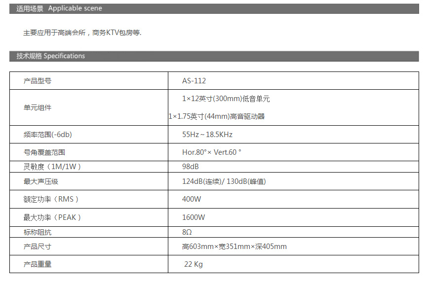 AS-112 是專為KTV應(yīng)用而設(shè)計的全頻揚聲器,它配備了大功率、*能的低音單元,和1.75寸的鈦振膜高音壓縮驅(qū)動器。特別設(shè)計的對稱單后置通風(fēng)對流孔散熱設(shè)計,結(jié)合高靈敏度的大功率低音單元,保證在大功率情況下、長時間能夠穩(wěn)定使用,AS系列具有后置出氣孔設(shè)計的增強低頻效果,同時具有前置出氣孔箱體設(shè)計的中頻靠前的風(fēng)格特性,克服了傳統(tǒng)后置出氣孔揚聲器中頻靠后和凹陷的問題,讓系統(tǒng)更容易輕松“入咪”。*1.75寸鈦振膜高音壓縮驅(qū)動器加上針對室內(nèi)近距離演唱設(shè)計的高頻號角,減小了對高頻信號的壓縮失真,使高頻細膩柔順,無論水平或垂直擺放,身處房間任何位置,都可以欣賞到一致均衡的聲音效果。