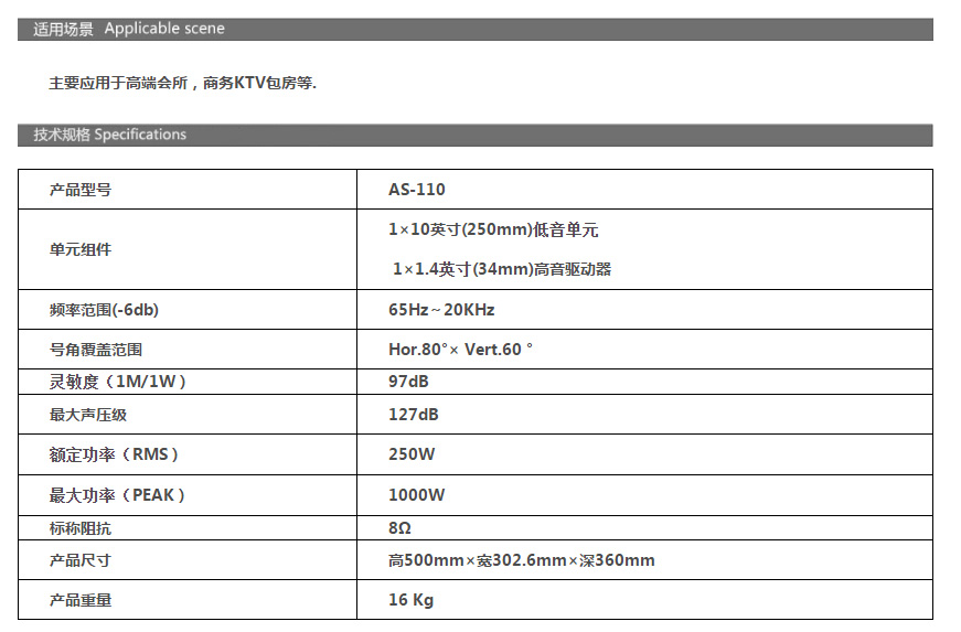 AS-110 是專為KTV應(yīng)用而設(shè)計(jì)的全頻揚(yáng)聲器,特別設(shè)計(jì)的對(duì)稱單后置通風(fēng)對(duì)流孔散熱設(shè)計(jì),結(jié)合高靈敏度的大功率低音單元,保證在大功率情況下、長時(shí)間能夠穩(wěn)定使用,AS系列具有后置出氣孔設(shè)計(jì)的增強(qiáng)低頻效果,同時(shí)具有前置出氣孔箱體設(shè)計(jì)的中頻靠前的風(fēng)格特性,克服了傳統(tǒng)后置出氣孔揚(yáng)聲器中頻靠后和凹陷的問題,讓系統(tǒng)更容易輕松“入咪”。高頻細(xì)膩柔順,無論水平或垂直擺放,身處房間任何位置,都可以欣賞到一致均衡的聲音效果。